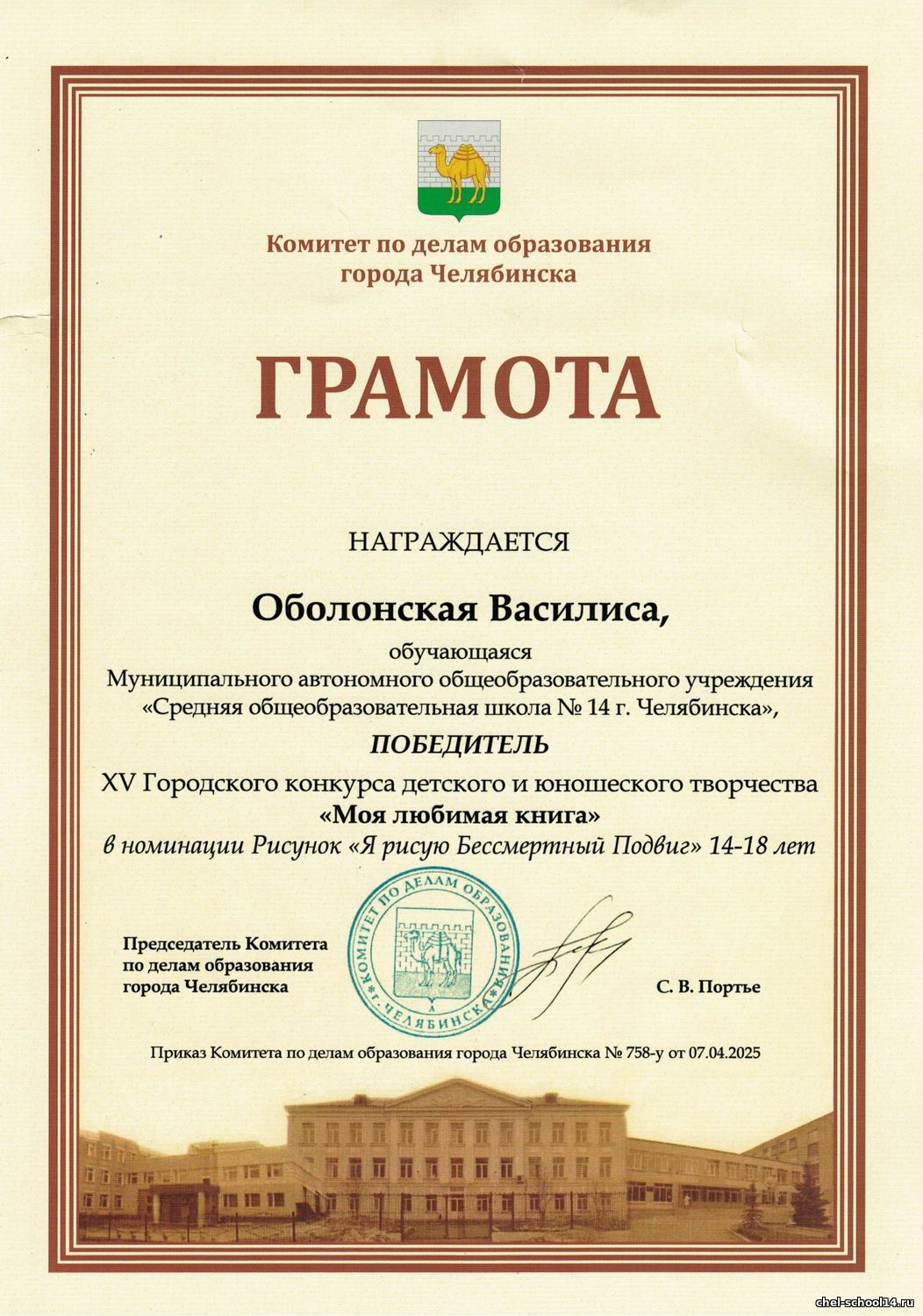 Поздравляем Оболонскую Василису из 10 класса с победой в городском конкурсе «Моя любимая книга»! 10 апреля 2025 года подведены итоги XV городского конкурса детского и юношеского творчества «Моя любимая книга». В 2025 году тема конкурса «В сердцах и книгах память о войне». В конкурсе приняли участие 110 образовательных организаций г. Челябинска, было представлено 774 работы. На районный этап от школы № 14 были представлены 2 работы: рисунок по книге Бориса Сопельняка «Солдат по кличке Рекс» Оболонской Василисы и Буклук по книге С.П. Алексеева «Последний штурм» Муравлева Артёма из 4-а класса. Оболонская Василиса стала победителем городского этапа конкурса в номинации «Я рисую Бессмертный Подвиг» и награждена Грамотой Комитета по делам образования г. Челябинска за 1 место. Муравлеву Артёму (4-а) вручили сертификат участника городского конкурса в номинации «Книга в объективе». Поздравляем Василису с победой, а Артёма с успешным дебютом в городском конкурсе «Моя любимая книга» и желаем дальнейших творческих успехов!