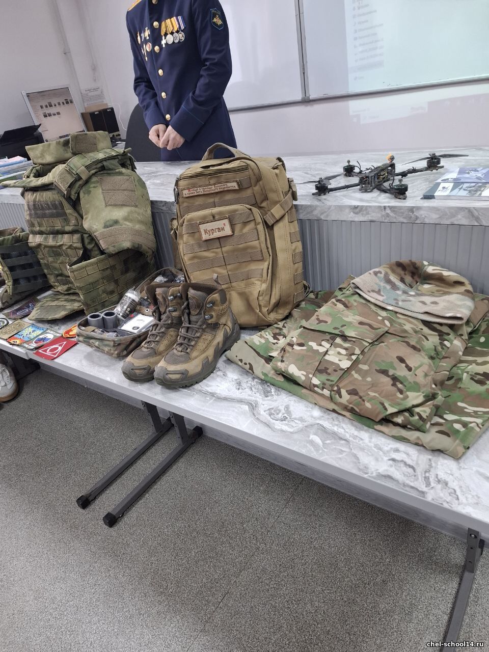 Участник СВО показал свое воинское обмундирование. Даже разрешил примерить одному из учащихся и почувствовать себя в роли военного! Показал трофейный сбитый БПЛА. Также рассказал о своих наградах.